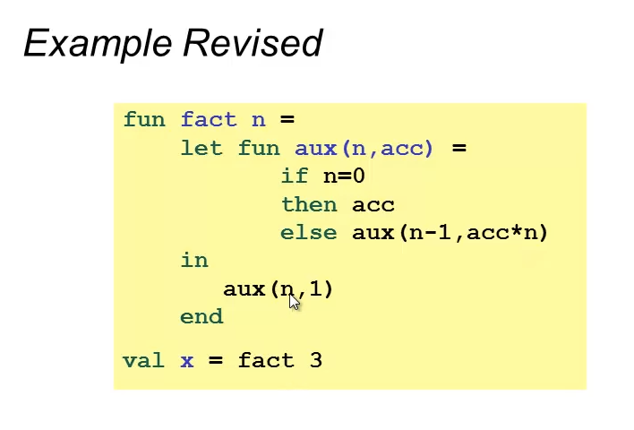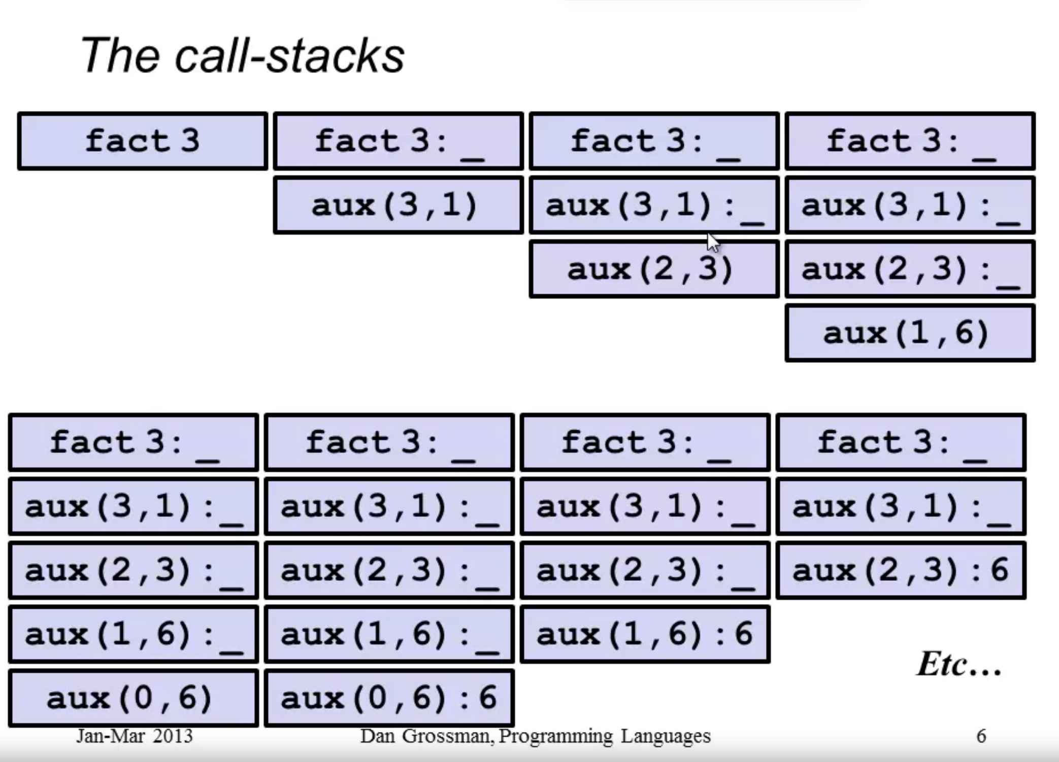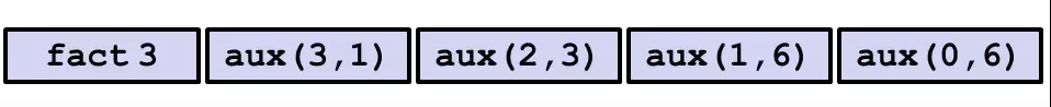 스택을 따로 만드는게 아니라, fact 프레임을 aux 프레임으로 바꾸고, 이대로 쭉 가서 끝나는거다. aux(0,6)을 반환하면 즉시 답을 얻는다.
