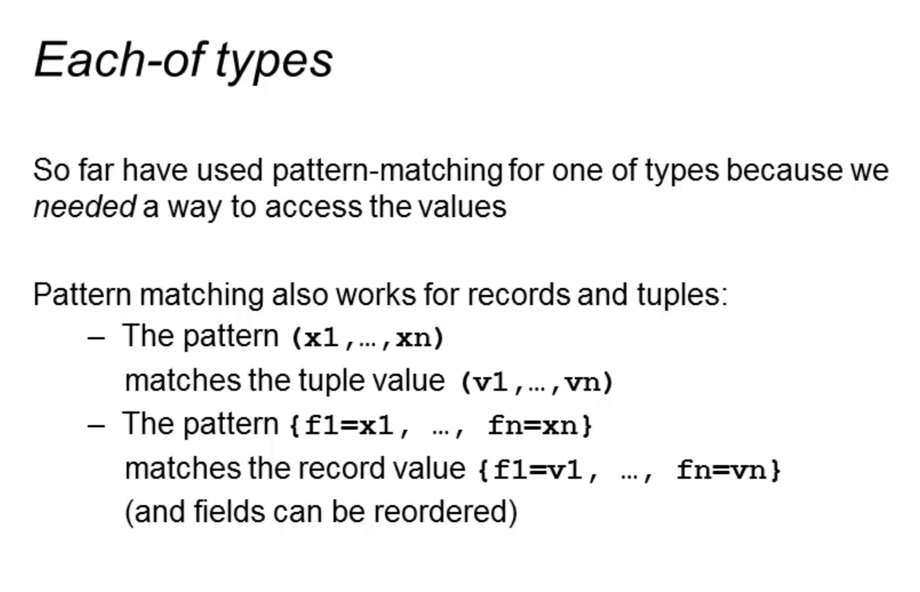 ML에서 함수는 실제로 오직 1개만의 변수를 갖는다. 그걸 가지고 함수 본문이 pattern matching을 통해, 튜플의 1번째, 2번째... n번째에 대해 어떤 작업을 할지 작동하는 것임!!