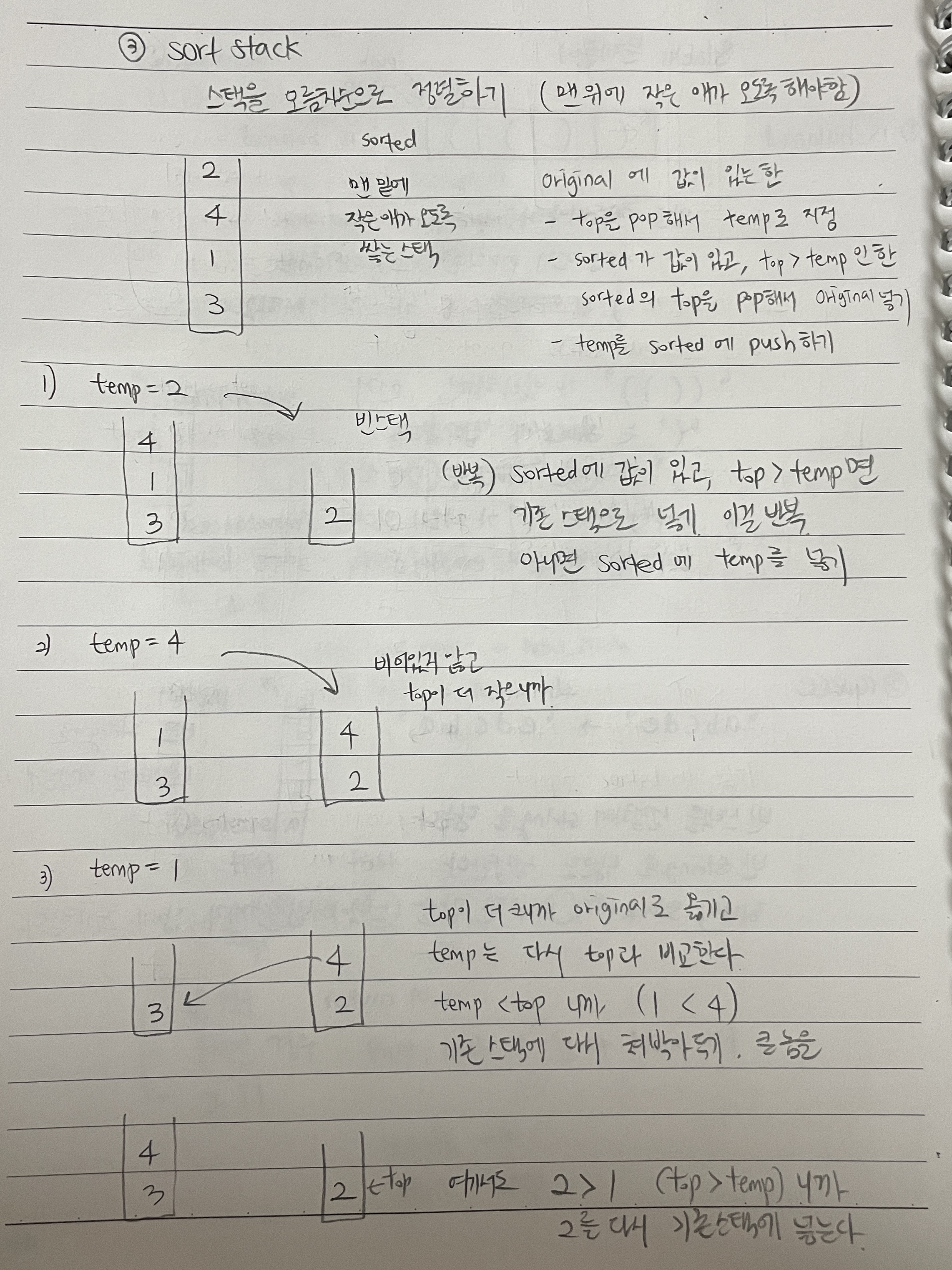 그러려면 기존 스택의 맨 위 값(temp)와 정리용스택의 top 값을 수시로 비교하면서