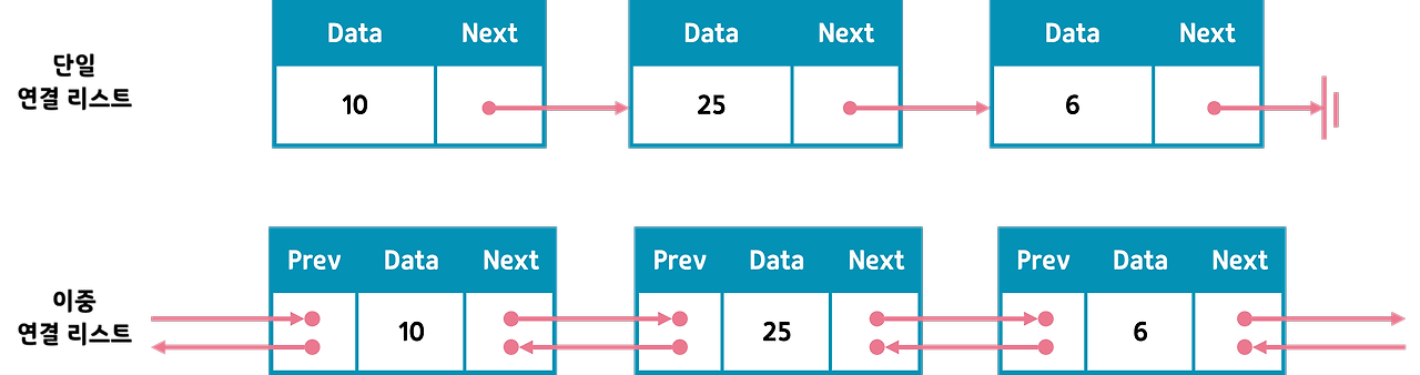 반면, 양방향 연결리스트는 head, tail과 앞뒤 링크가 모두 있으므로