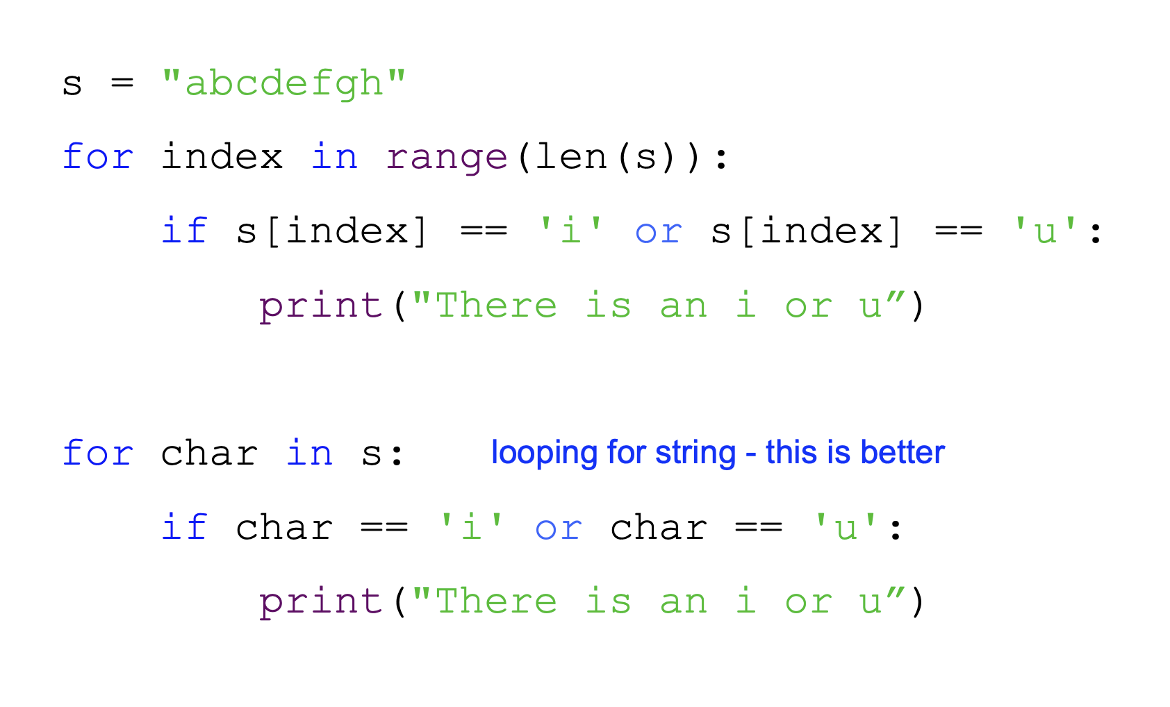 If they're not the same, check if the test character is "smaller" than the middle character. If so, we need only consider the lower half of the string; otherwise, we only consider the upper half of the string. (Note that you can compare characters using Python's < function.)