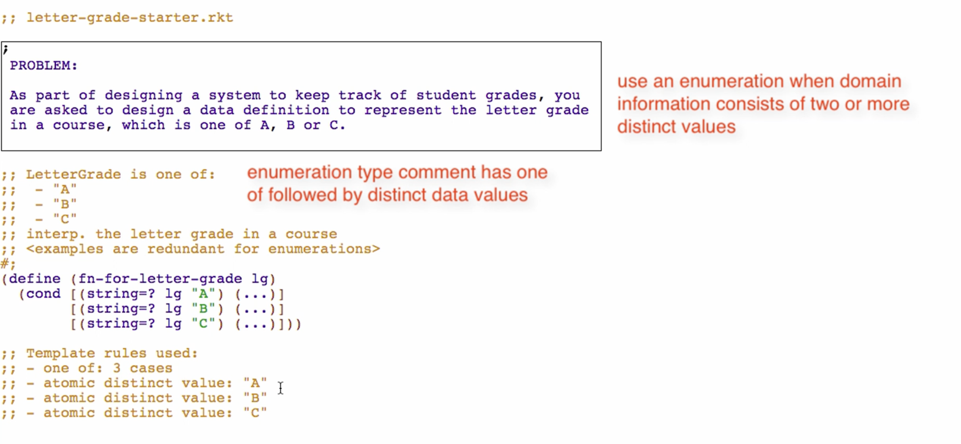 Use an enumeration when the information to be represented consists of a fixed number of distinct items, such as colors, letter grades etc.